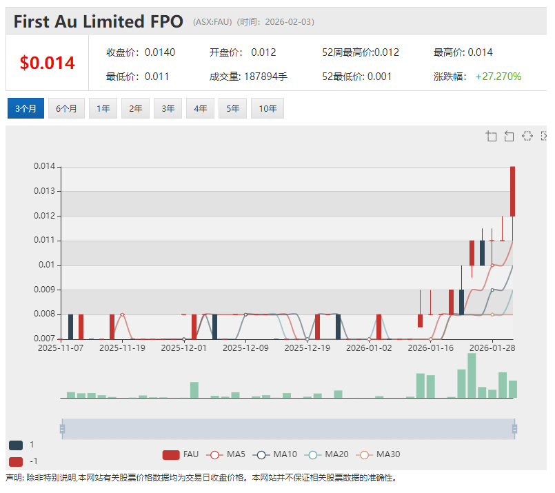 澳华财经在线数据库显示,FAU最新价0.014澳元,已发行股本28.5亿股,市值3993万澳元。