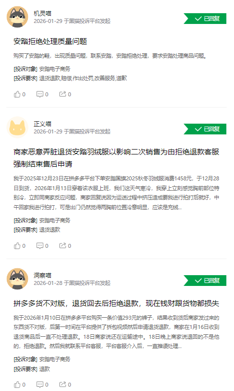 浏览黑猫投诉平台,截至2月2日,安踏累计相关投诉共5234条,主要涉及产品质量、服务及售后纠纷等质疑。
