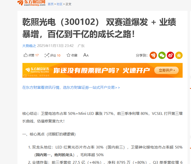 1、乾照光电卫星电池市占率 50%(绝对的龙头)+Mini LED (高端电视用)暴涨 757%,前三季净利增 80%,VCSEL 打开第三增长曲线,估值修复潜力大!