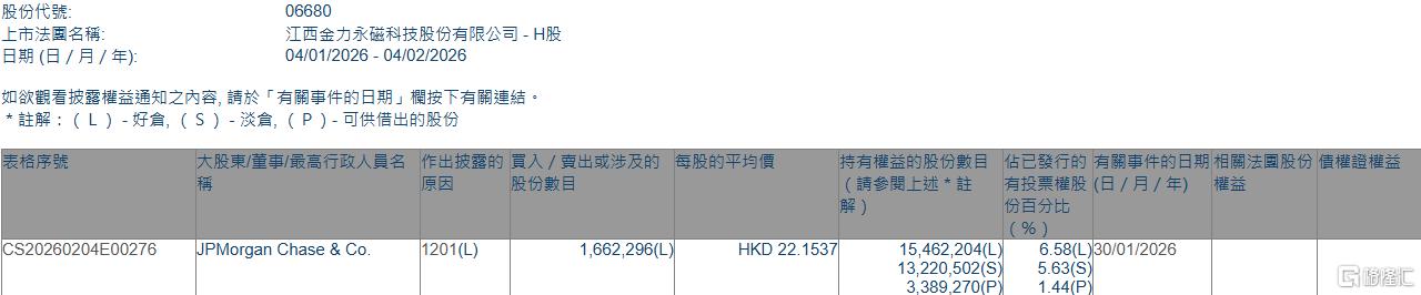 格隆汇2月4日丨根据联交所最新权益披露资料显示,2026年1月30日,金力永磁(06680.HK)遭JPMorgan Chase & Co.以每股均价22.1537港元减持好仓166.23万股,涉资约3682.6万港元。