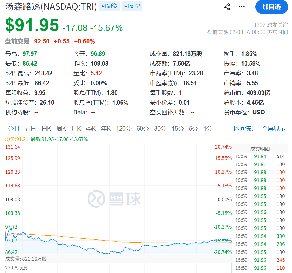 汤森路透、Legalzoom和伦敦证券交易所的股价均下跌超过12%,这些公司都提供某种形式的法律工具或研究数据库。