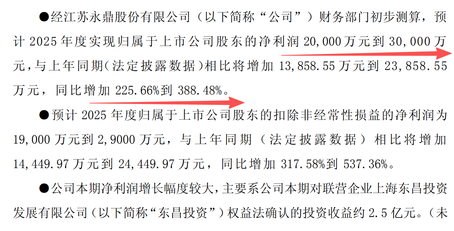 永鼎股份,这个股票2025年净利润增长226%到388%,净利润达到2亿到3亿元。