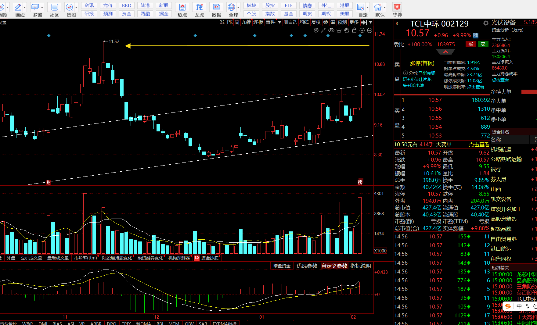 中环昨天受消息资金放量涨停,突破了上升通道的上轨,前面有低吸的可以借后面的拉伸分批兑现利润,底仓你可以选择继续持有不动,低吸加仓的兑现就行!看看能否这波到11.52附近或者继续新高。