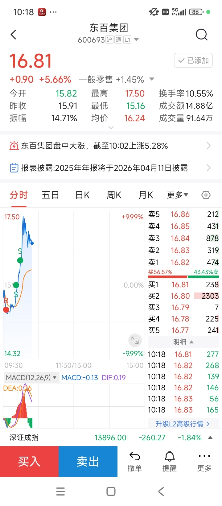 今作很清晰:早盘东百集团低开至 15.16 元,我果断低吸加仓,随后它冲高到 17.50 元,我立马执行高抛,等利润冲到 15 个点时,又果断抛掉一半仓位,账户直接回血 151.32 元,总资产来到 5779.14 元,落袋为安才是真!![财力 [财力]](http://gbfek.dfcfw.com/face/emot_default_28x28/emot66.png)