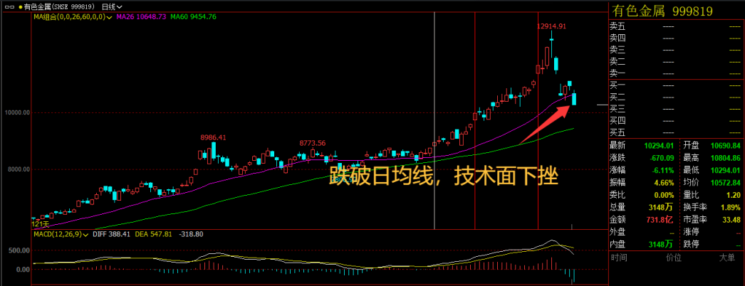 有色金属今天一根大阴线跌了4.77%,技术死叉加上跌破26日线,双重的技术破位信号非常扎眼。这让我的态度不得不从乐观转向谨慎。