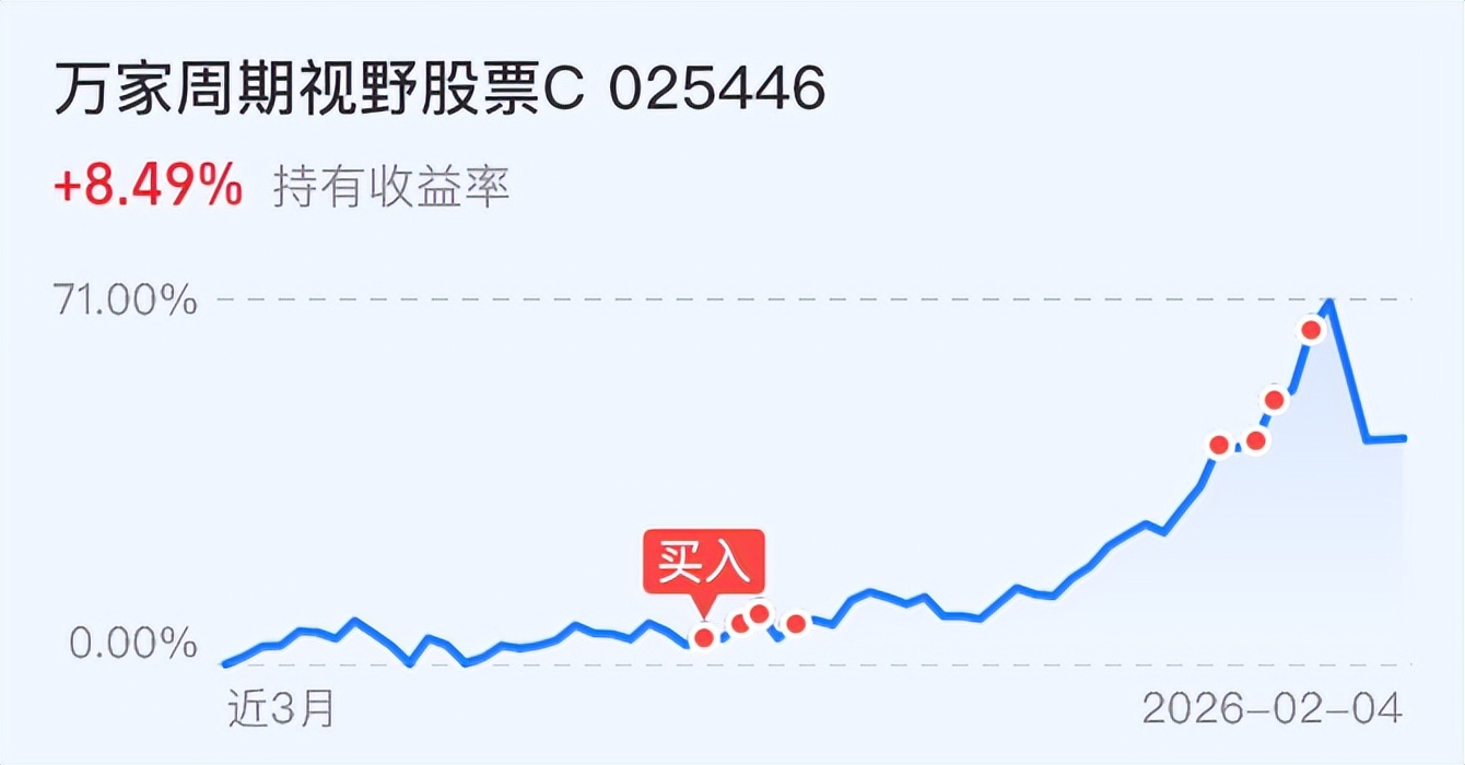 万家周期这几天表现一般,主要是他重仓的是黄金股票,这几天黄金股票没涨,所以震荡,另外这个万家周期我们是底部抄底的,最高的时候盈利40多个点,短期虽然调整了,目前总体还是盈利,等他反弹差不多我就准备止盈清仓。