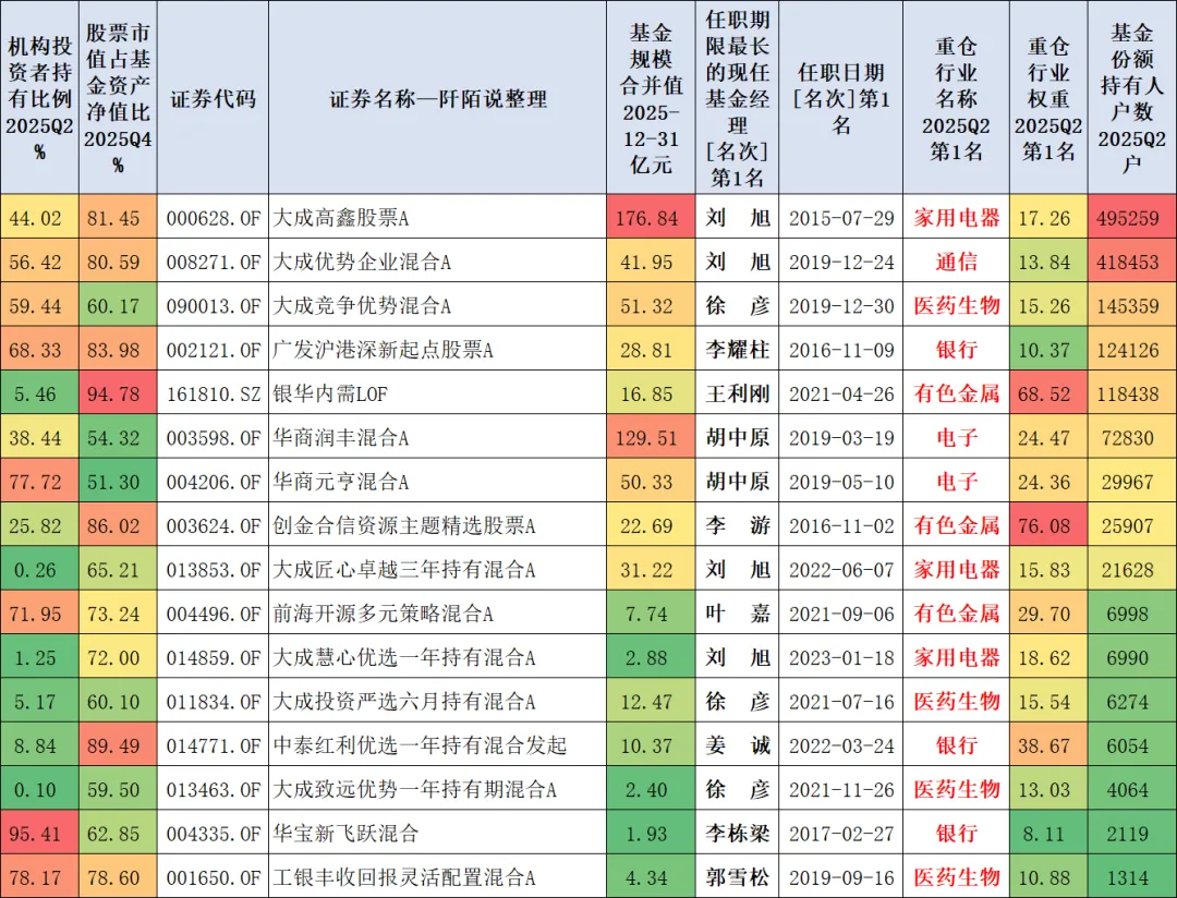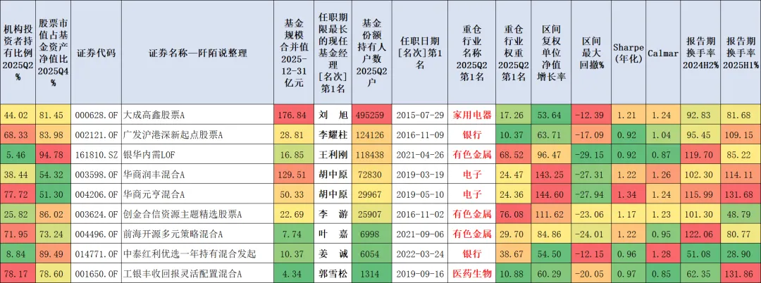 展示一下16只基金2025Q2持有人户数,刘旭的两只基金持有人户数超40万户,相对比较“热门”。