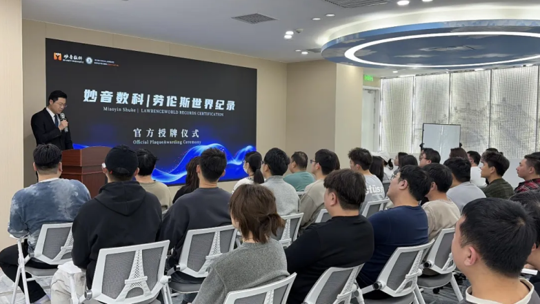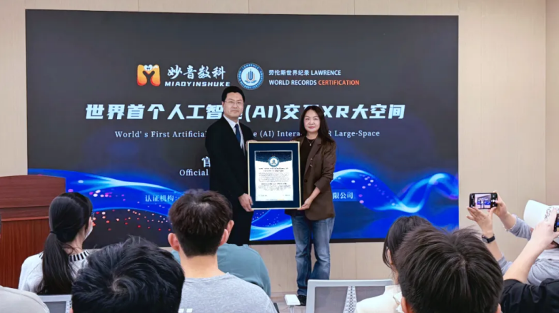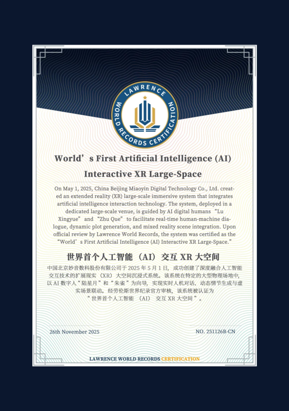 2026年2月2日,妙音数科&劳伦斯世界纪录官方授牌仪式正式举行。仪式现场,劳伦斯世界纪录中国区总裁李海涛先生宣读认证声明,明确“经劳伦斯世界纪录官方审核,由北京妙音数科股份有限公司(以下简称“妙音数科”)创建的深度融合人工智能交互技术的扩展现实(XR)大空间沉浸式系统被认证为‘世界首个人工智能(AI)交互XR大空间’”。