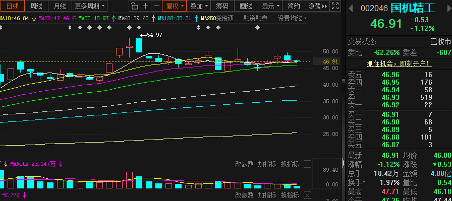 昨日低开低走至收盘跌幅1.12%,昨日核心是主力资金连续流出、前期获利盘兑现、高估值承压、资金高低切换与大盘情绪共振,叠加轴承 / 半导体材料赛道分化,股价震荡下行,全市场超 3600 股下跌,资金转向银行、消费等防御板块,高位成长标的受资金避险情绪影响,国机精工同步承压,但是国机算是还好没破趋势30日线,既然没破就先拿住了,震荡期间多做做t就好了。