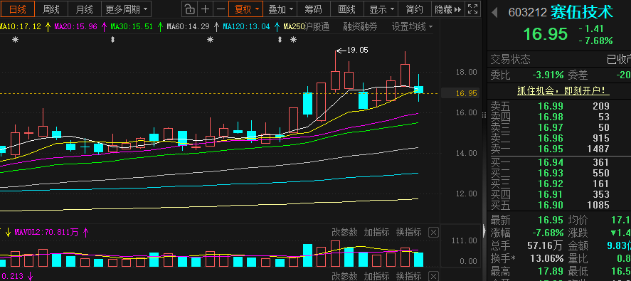 正 踢:平开 / 低开至16.5-16.7附近缩量时进货,反弹17.2-17.5附近踢加仓部分,赚差价反弹无力则及时止盈。