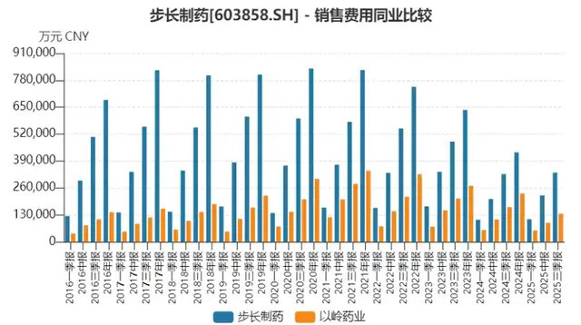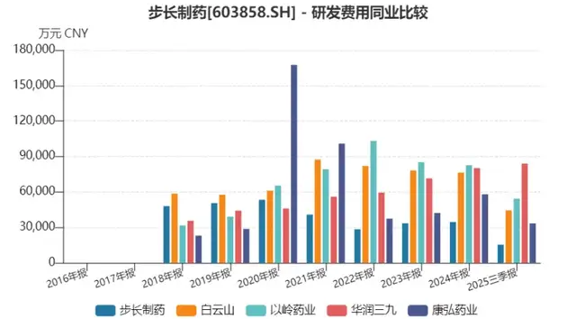 由于研发与创新乏力,靠老品种和销售驱动已然难以为继:2025年恩格列净片上市申请被撤回,研发转化能力备受争议,生物药、疫苗等新领域也尚未形成收入贡献,核心产品脑心通、丹红注射液销售下滑。研发实力上,步长制药2025年前三季度研发费用率仅为1.81%,不足以岭药业的五分之一,在WIND制药三级行业中排名217位。