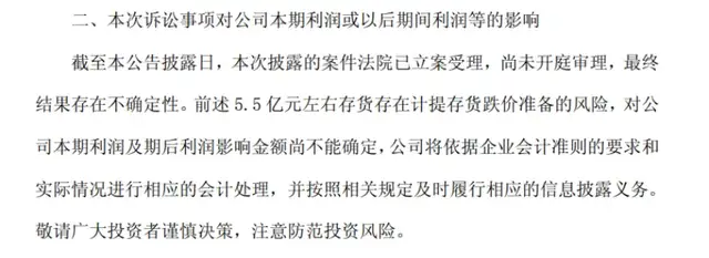 步长制药在公告中明确提示:“案件的最终结果存在不确定性,涉及5.5亿元左右存货存在计提存货跌价准备的风险,对公司本期利润及期后利润影响金额尚不能确定。”