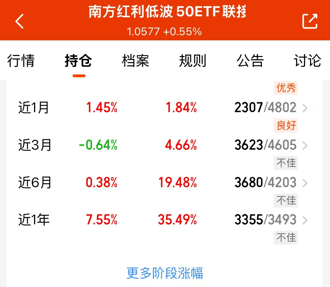 我加仓 $南方红利低波50ETF联接C(OTCFUND|008164)$ 1000。最近行情加速轮动,短期节奏不好把握,因此酸酸是打算布局红利了,一是红利具备的低波属性,在震荡市也会有不错的试错表现;二是在春节将至,市场风格或更趋于防守,红利高股息特性也将因此放大,从而吸引资金涌入。
