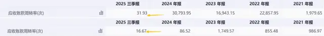 经营活动现金流上,2025年前三季度,酒鬼酒为-3.26亿元,水井坊更是低至-8.67亿元。水井坊除了上述的新项目投入之外,与酒鬼酒的共同困境在于:应收账款周转率大幅下降,回款速度急剧恶化,大量资金被占用在渠道和库存里。