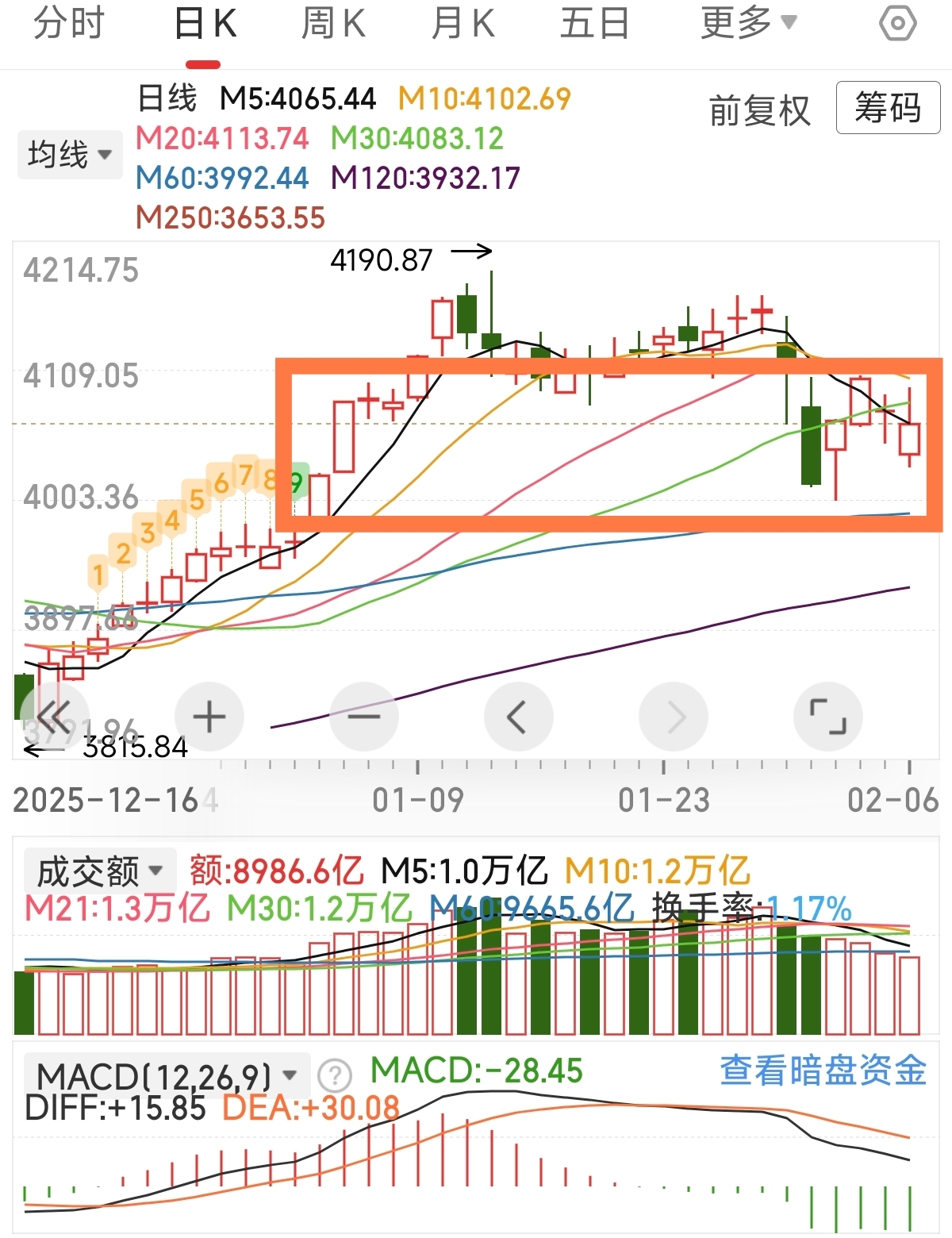 二月的日线开门红泡汤了,周线开门红也是泡汤了。节前估计盘面就在4100点附近震荡整 理了,想要向上突破可能性不大了。上面近期有两个缺口,一个是4117,一个是4102.相信下周还是会补掉的,应该不会留下过年了。但是个面的缺口3968,年前可能补不了,也可能突然破一下,也不是不可能了。所以年前最后一周的盘面就在3968和4150中间波动吧。大家不要贪心,也不要恐慌,抓住机会抢鸡腿,捡 卤蛋,还是有大把机会的。![色 [色]](http://gbfek.dfcfw.com/face/emot_default_28x28/emot16.png)