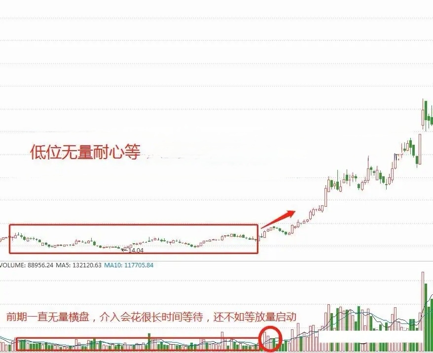 一只股票低位长期横盘的时候,感觉安全和便宜,但是如果他成交量没有释放出来的话,就不要着急介入,因为无量说明主力还没有进场或者洗盘还未结束。