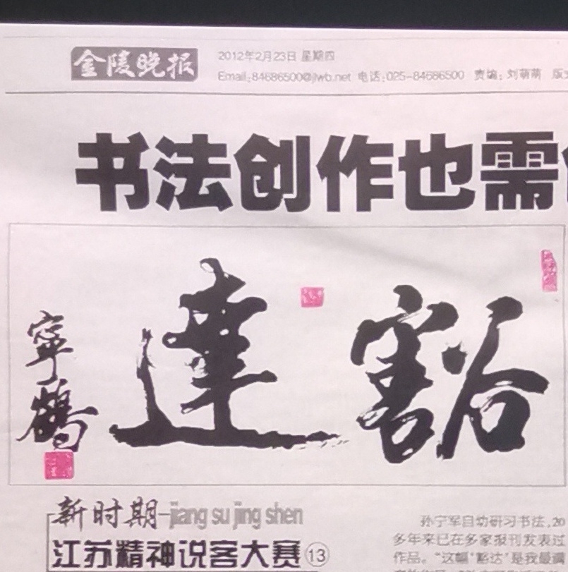 无论你查看2012年2月23日在文化大省江苏省发行量最大的报刊《金陵晚报》上用半版免费发表的我的《书法创作也需创新精神》的获奖作品《豁达》,还是在央视网上也可以查到我的书法艺术创新获奖的信息;再无论你点击华为应用市场之后,再点击文心,再点击《书法创作也需创新精神》孙宁军创作书法作品:豁达,获奖,还是网上使用元宝搜索《书法创新也需创新精神》孙宁军获奖作品:豁达。都全面证明了我的这幅《豁达》创新艺术作品是史无前例,前无古人,后无来者的创新的艺术作品。
