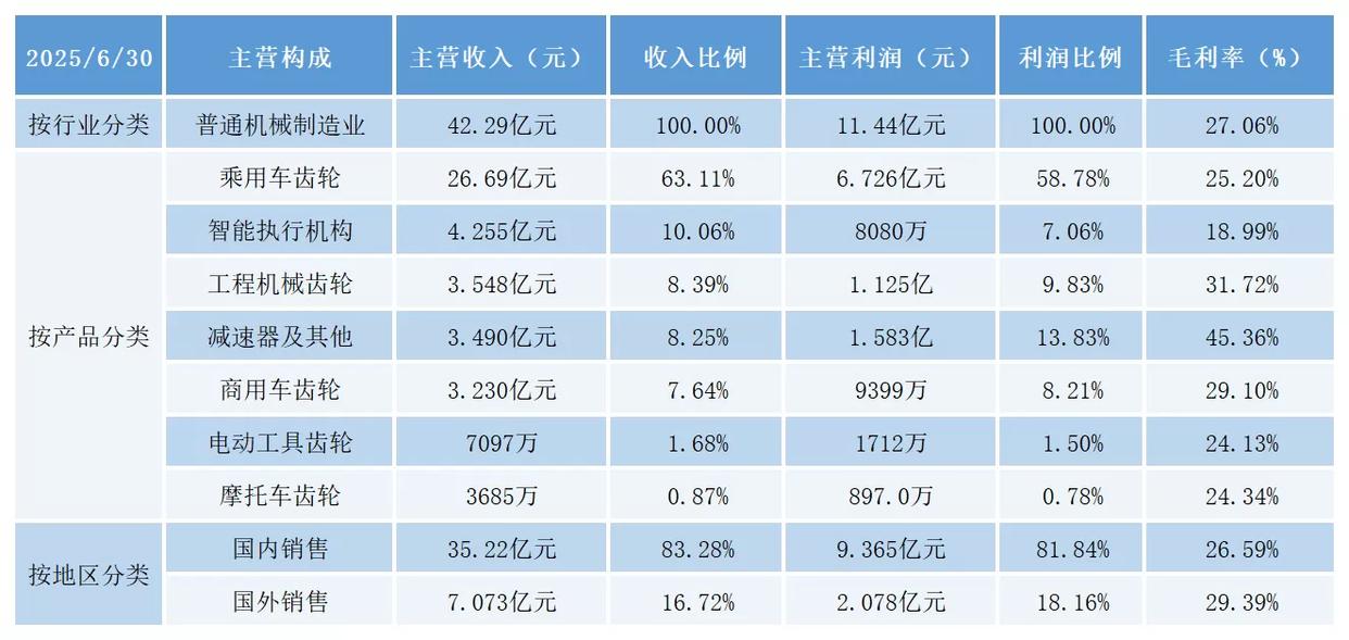 经过多年发展,双环传动齿轮产品已覆盖车、机器人、工程机械等多个领域。其中,乘用车齿轮是收入的主要来源,2025年上半年占比达63.11%,工程机械齿轮占比8.39%,商用车齿轮占比7.64%。