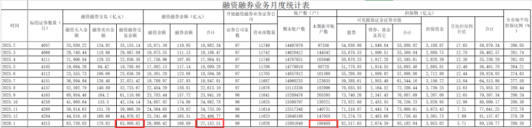 数据显示,1月融资融券新开户数达19.05万户,较2025年12月的14.71万户环比增长29.5%,较2025年1月的7.4万户同比大增157%。仅略低于2025年9月创下的全年峰值20.54万户。