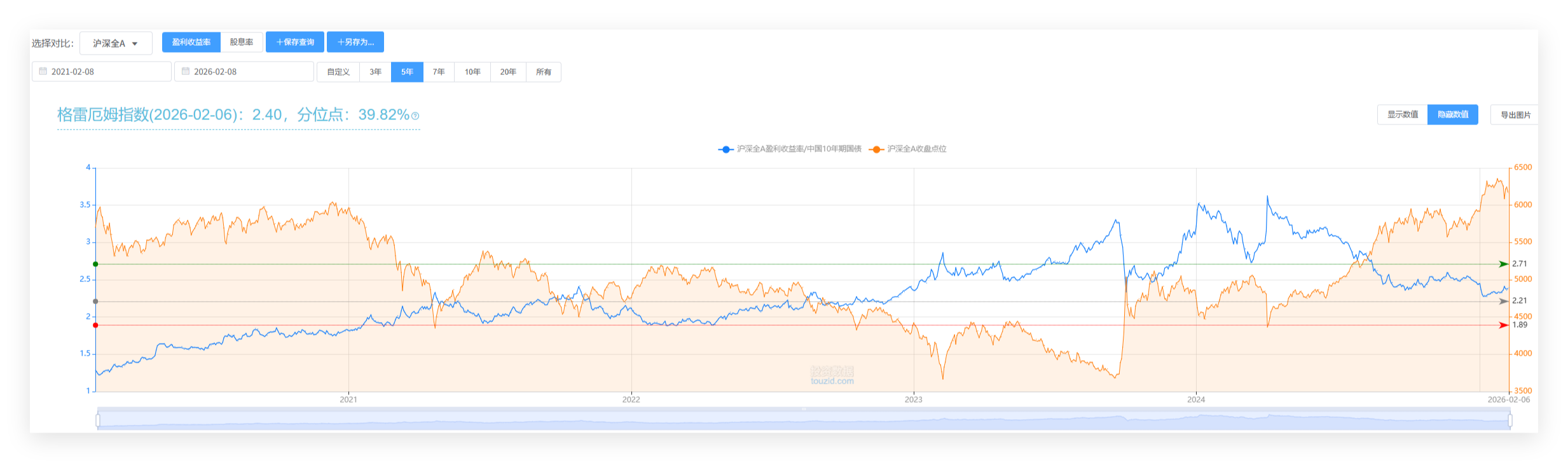 采自投资数据网的图表显示,截至2026年2月6日收盘,沪深全A的格雷厄姆指数为2.40,处于近五年39.82%的分位点,也就是说当前的A股整体比近五年39.82%的时间贵。