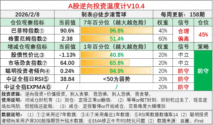1、仓位指标:综合巴菲特指数和格雷厄姆指数,当前市场估值合理偏高,合适仓位约45%。