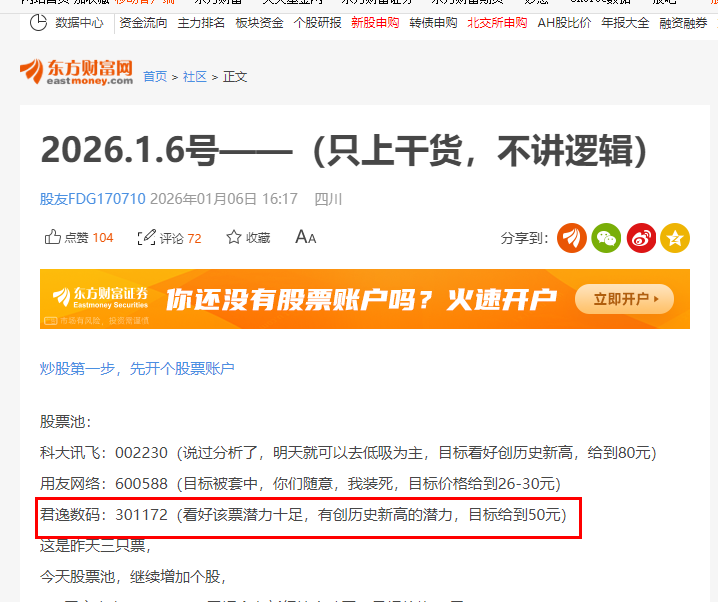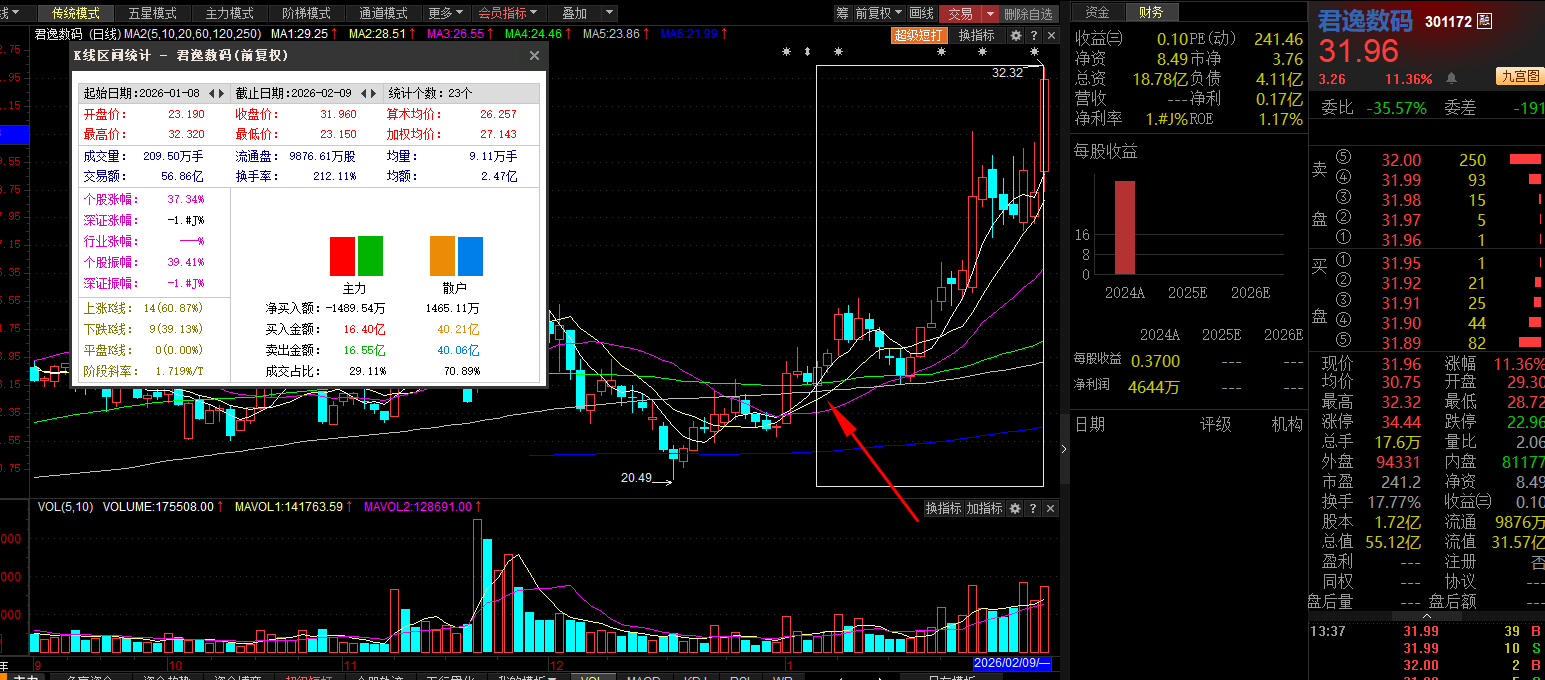 1:股票池里面的君逸数码:3011172 (提示后到今天,涨幅差不多快40%了,给出边打边撤的操作策略了)