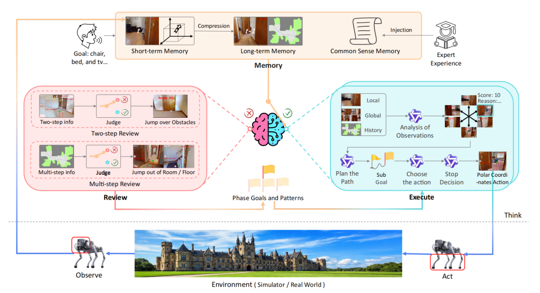 想让机器人在从未去过的家里帮你找手机?阿里高德与西安交大团队提出的 MerNav 框架,在此类“零样本物体目标导航”任务上取得了突破。其核心是模仿人类的认知逻辑,构建 “记忆-执行-复盘” 三层架构。机器人不仅会边探索边建地图(记忆),还能在碰壁或陷入死胡同时启动“复盘”机制,调整策略。
