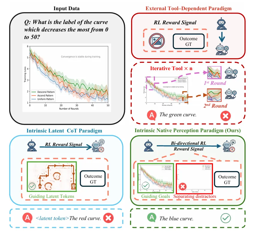 视觉-语言模型(VLM)常犯一种令人啼笑皆非的错误:推理逻辑完美,结论却全错,根源在于它“看”错了图上的关键证据。微软亚洲研究院与清华大学合作提出的 BiPS(双向感知塑形) 框架,直击此痛点。它摒弃了在推理时临时给模型“指路”的常规做法,而是在训练阶段就通过“一拉一推”的机制,内化地教会模型:面对不同问题,视线该自动聚焦在哪里。
