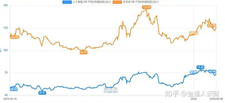 人工智能PE高达近70倍,半导体PE更是高达130倍。