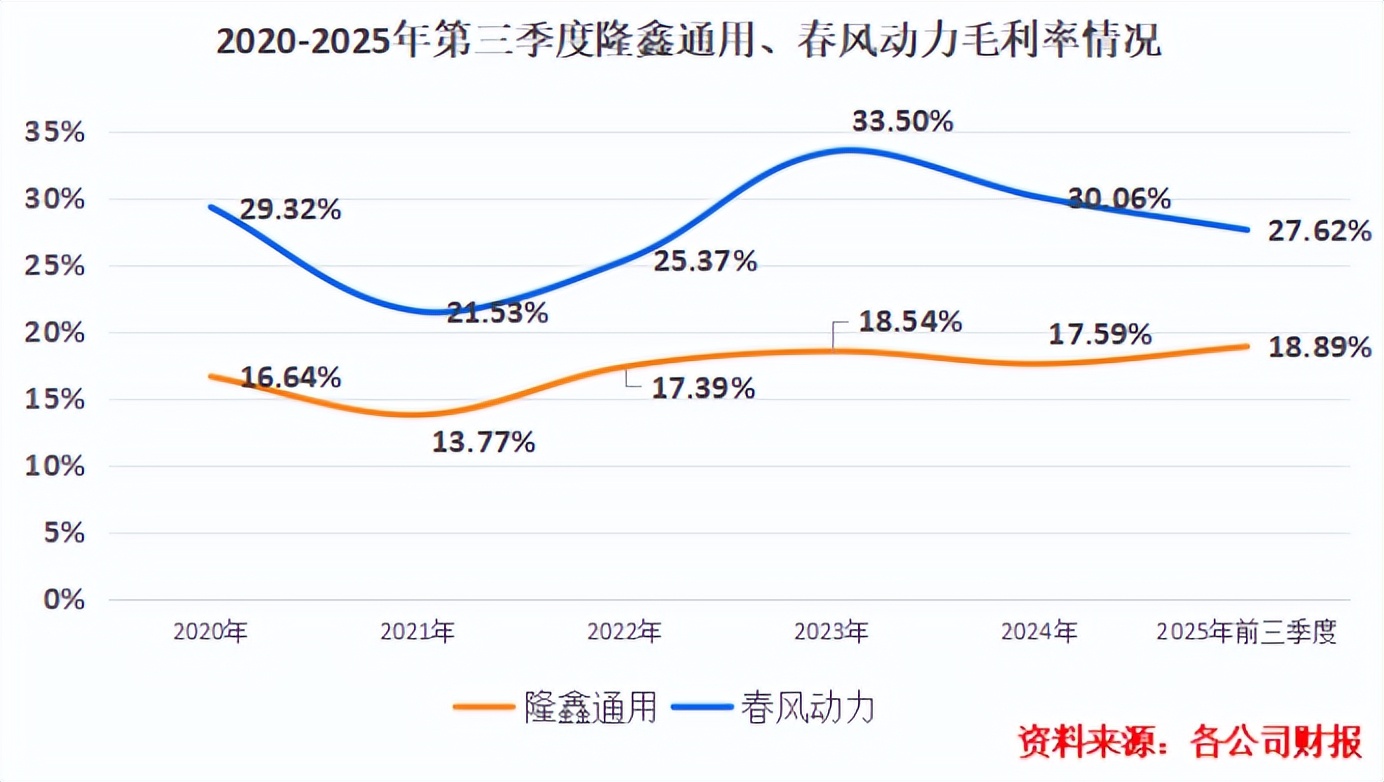 随着高毛利产品的不断放量,2025 年前三季度,隆鑫通用的毛利率提升至 18.89% ,同比增加了 3.26 个百分点。这一提升,不仅反映了公司产品结构的优化,也表明了公司在成本控制与运营效率方面取得了显著成效。与春风动力的毛利率差距进一步缩小,也让隆鑫通用在市场竞争中更具底气。