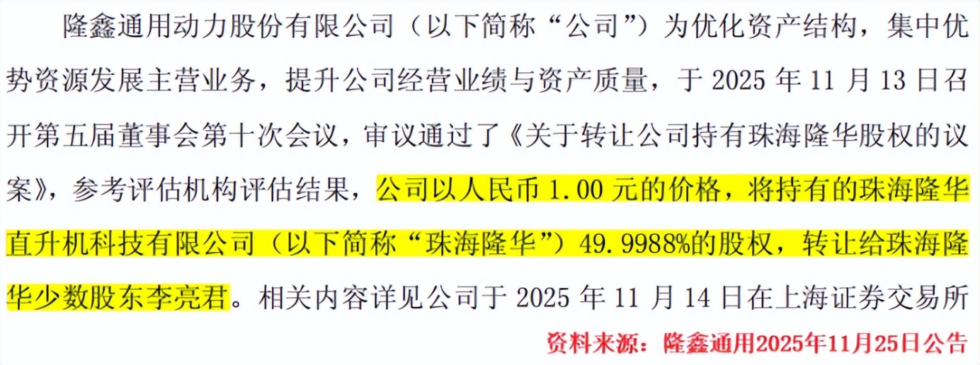 仅仅 11 天后,11 月 25 日,隆鑫通用又做出了一个令人震惊的决定:拟以 1 元人民币的象征性价格,转让所持珠海隆华的全部股权,暂时退出无人机业务 。珠海隆华作为隆鑫通用投资的无人机业务平台,成立 12 年来,仅有 3 年实现微利,长期处于经营亏损状态 。截至 2025 年 10 月 31 日,珠海隆华账面净资产为 - 6735.17 万元,已深陷 “资不抵债” 的困境 。此次转让,不仅避免了珠海隆华继续亏损对公司业绩的负面影响,还为公司回笼了一定的资金。