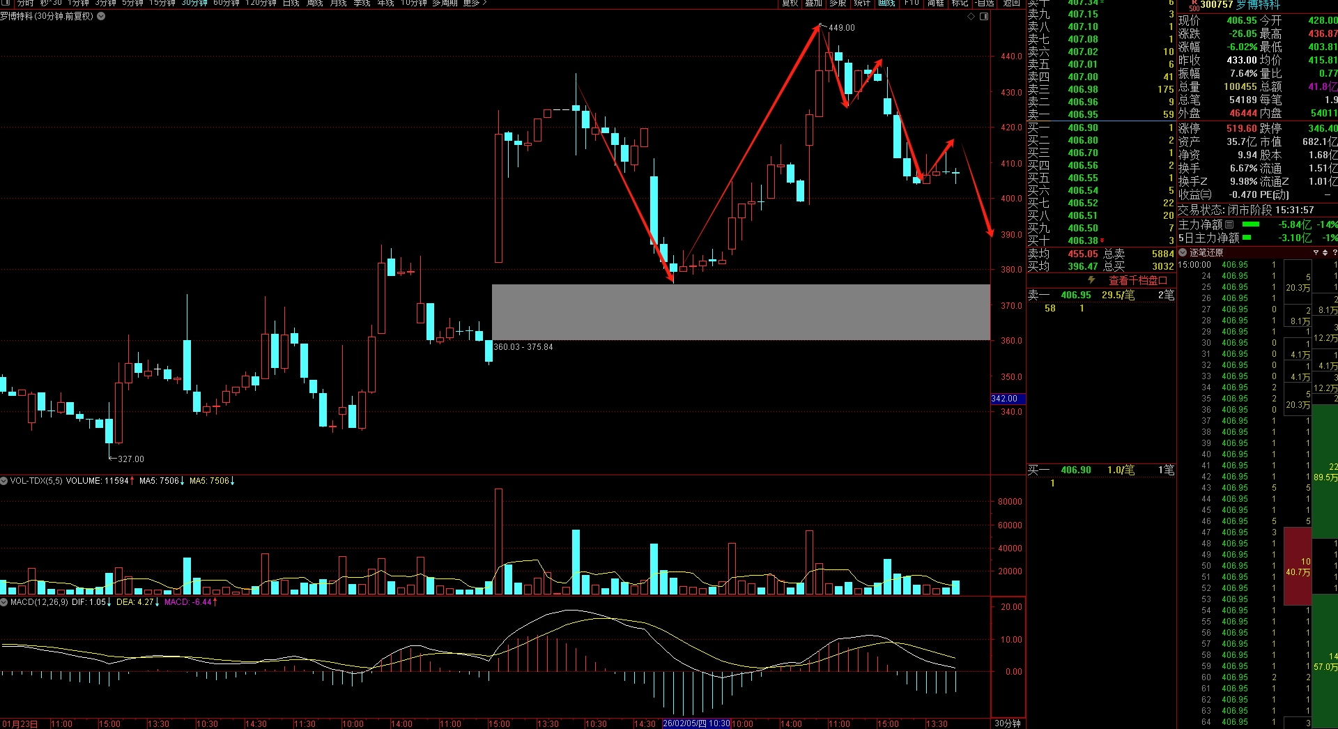 长线标的$罗博特科(SZ300757)$开盘下跌股价跌破5分钟下跌3浪(411.50)位置,在407.35买入。继续下跌的话等5浪到位再买一笔。
