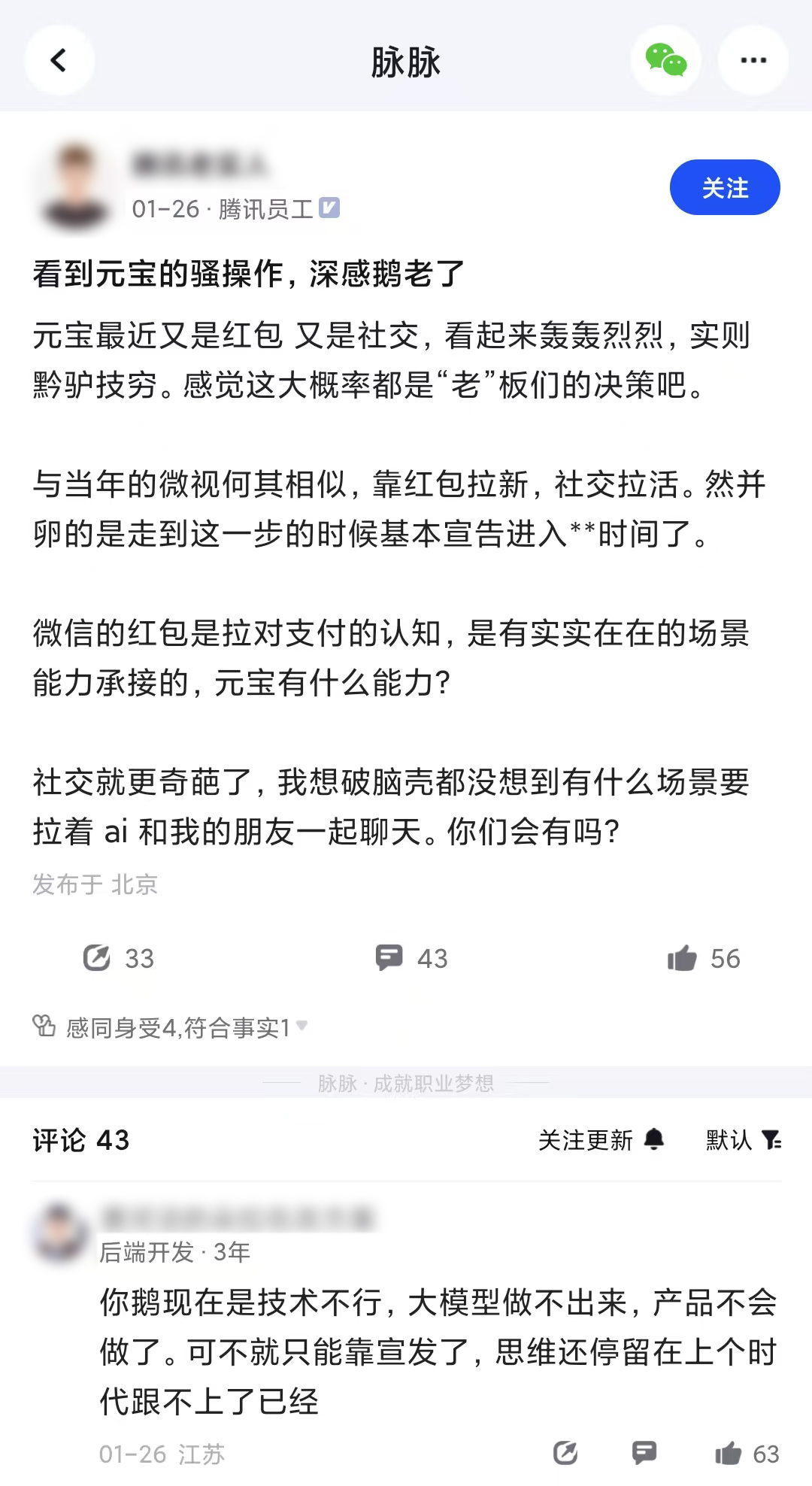 在该活动推出之前,就有腾讯员工标识的网友在脉脉上吐槽鹅厂老了,据此人分享:“元宝最近又是红包又是社交,看起来轰轰烈烈,实则黔驴技穷。微信的红包是拉对支付的认知,是有实实在在的场景能力承接的,元宝有什么能力?社交就更奇葩了,我想破脑壳都没想到有什么场景要拉着AI和我的朋友一起聊天。”
