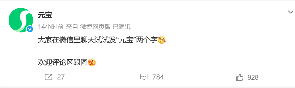 2月10日,元宝派发红包又出了新“玩法”。元宝官方微博发文邀请,大家在微信里聊天试试发“元宝”两个字。