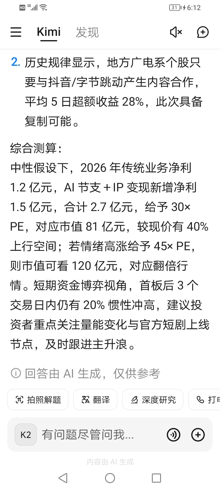 中性假设下,2026 年传统业务净利 1.2 亿元,AI 节支+IP 变现新增净利 1.5 亿元,合计 2.7 亿元,给予 30× PE,对应市值 81 亿元,较现价有 40% 上行空间;若情绪高涨给予 45× PE,则市值可看 120 亿元,对应翻倍行情。短期资金博弈视角,首板后 3 个交易日内仍有 20% 惯性冲高,建议投资者重点关注量能变化与官方短剧上线节点,及时跟进主升浪。