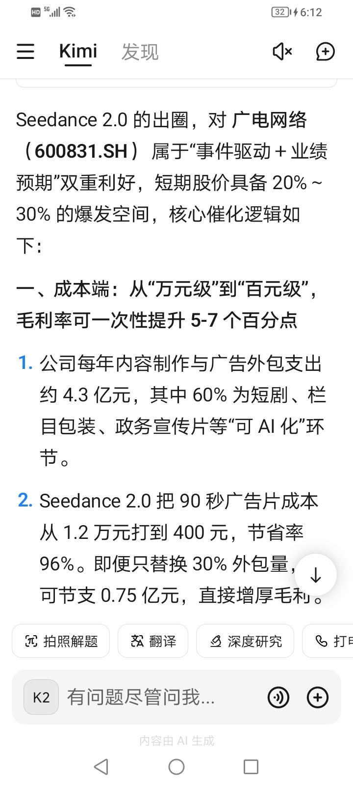 Seedance 2.0 的出圈,对 广电网络(600831.SH) 属于“事件驱动+业绩预期”双重利好,短期股价具备 20%~30% 的爆发空间,核心催化逻辑如下: