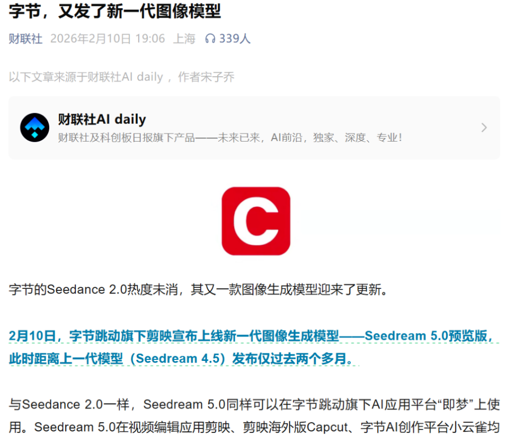 Seedance 2.0的热度还没下去,晚上字节新模型又来了!2月10日,字节跳动旗下剪映宣布上线新一代图像生成模型——Seedream 5.0预览版。对标Nano Banana Pro。