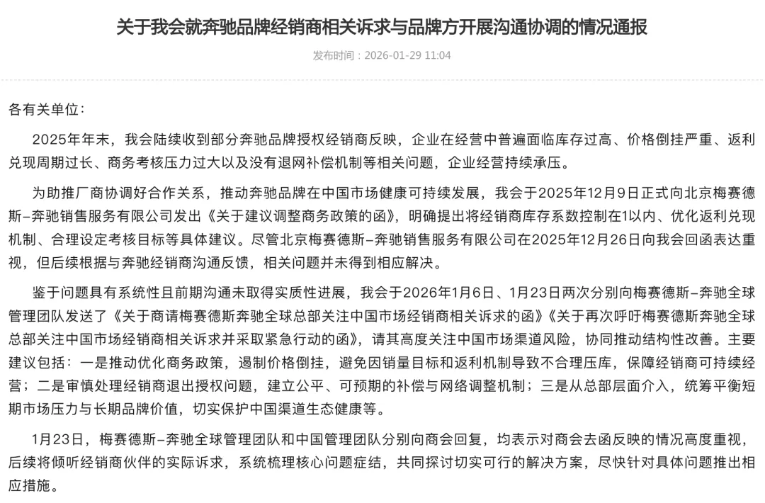 全国工商联汽车经销商商会(简称“商会”)于1月28日发布通报显示,奔驰与经销商的矛盾已经超出日常摩擦,形成了需要紧急处理的系统性问题。也正是该商会将奔驰厂商间的问题,跃然纸上,成为舆论焦点。