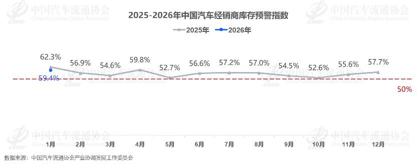 1月31日,中国汽车流通协会(简称“流通协会”)发布数据显示,2026年1月中国汽车经销商库存预警指数为59.4%,同比下降2.9个百分点,环比上升1.7个百分点,仍处于50%荣枯线之上。