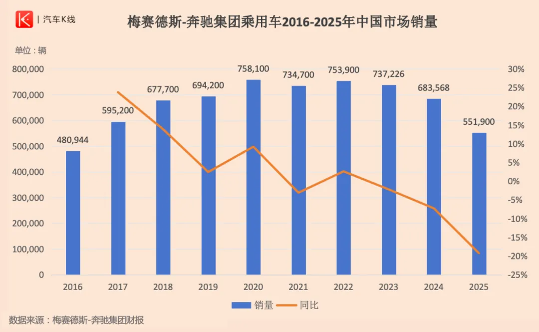 反观销量,2025年奔驰在华销售55.19万辆(乘用车),同比减少19%,直接退回大约十年前水平,平均单店年销不足800辆。$梅赛德斯-奔驰(OTCBB|MBGAF)$
