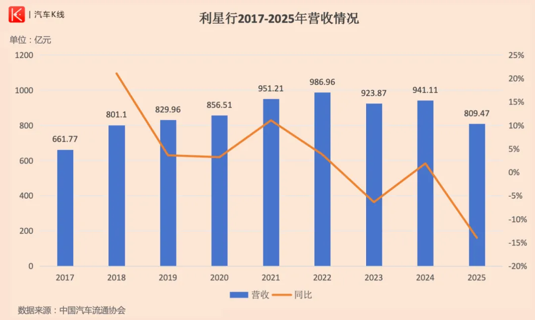 次年,利星行业绩走上下坡路,连续三年营收、销量双降,回到2018-2019年水平。2025年营收809.47亿元,同比大幅下滑13.99%;同年销量22.35万辆,同比下滑8.02%。
