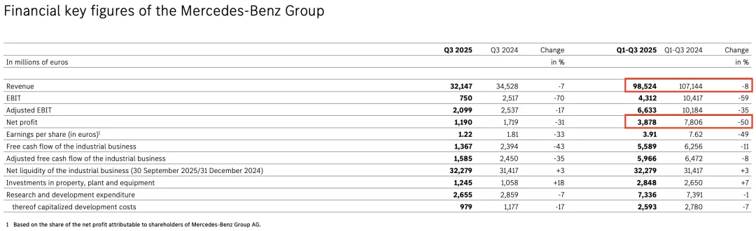 2025年前三季度,梅赛德斯-奔驰集团实现营收985.24亿欧元,同比下滑8.05%;净利润38.78亿欧元,同比下滑50.32%,直接腰斩。