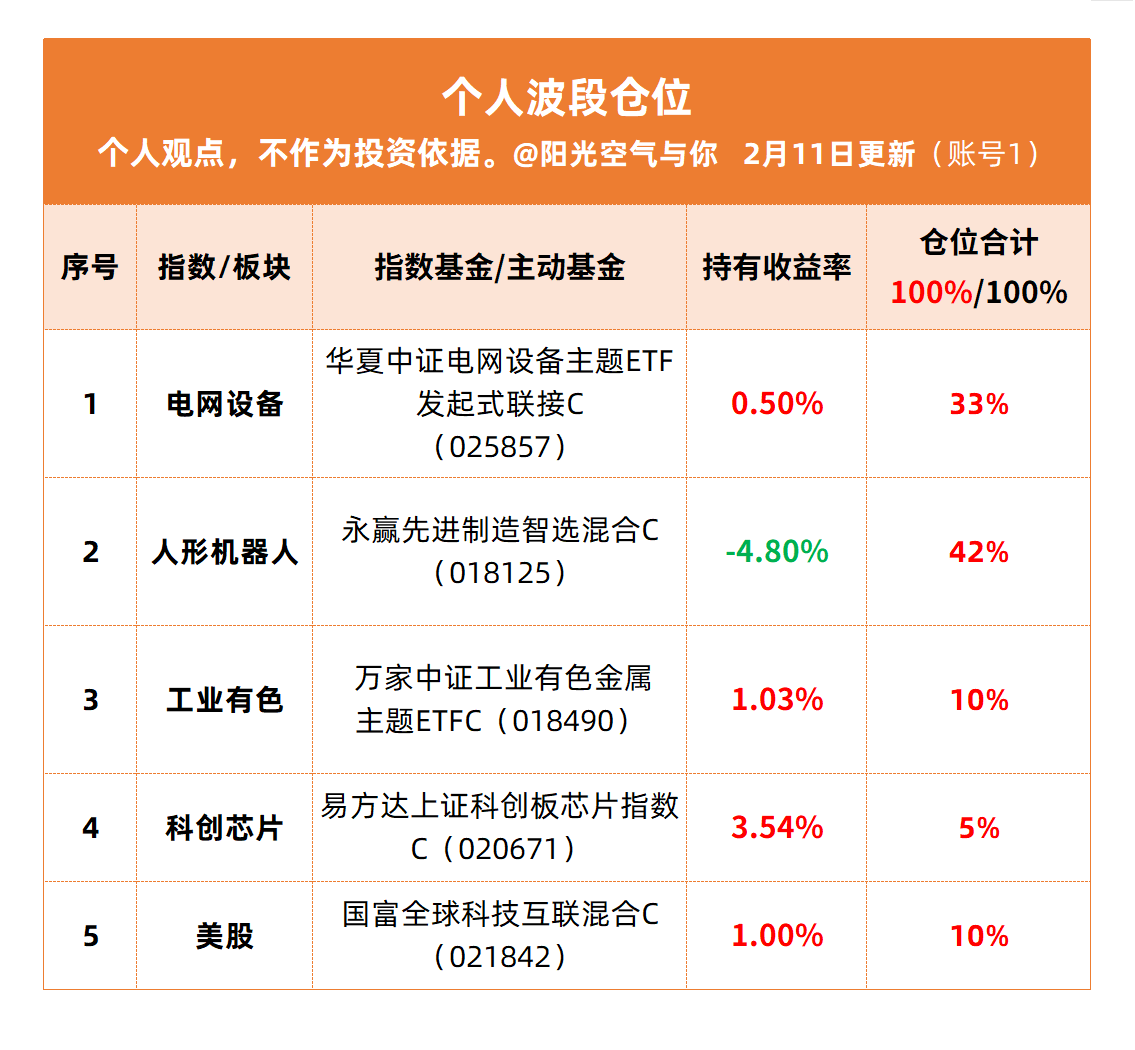 (4)人形机器人板块下跌,短期趋势相对一般,看春晚亮相看看能不能催化一下短期市场情绪了,大方向上没什么问题,等节后再说。阳光个人持仓观望。相关基金:$永赢先进制造智选混合C$。