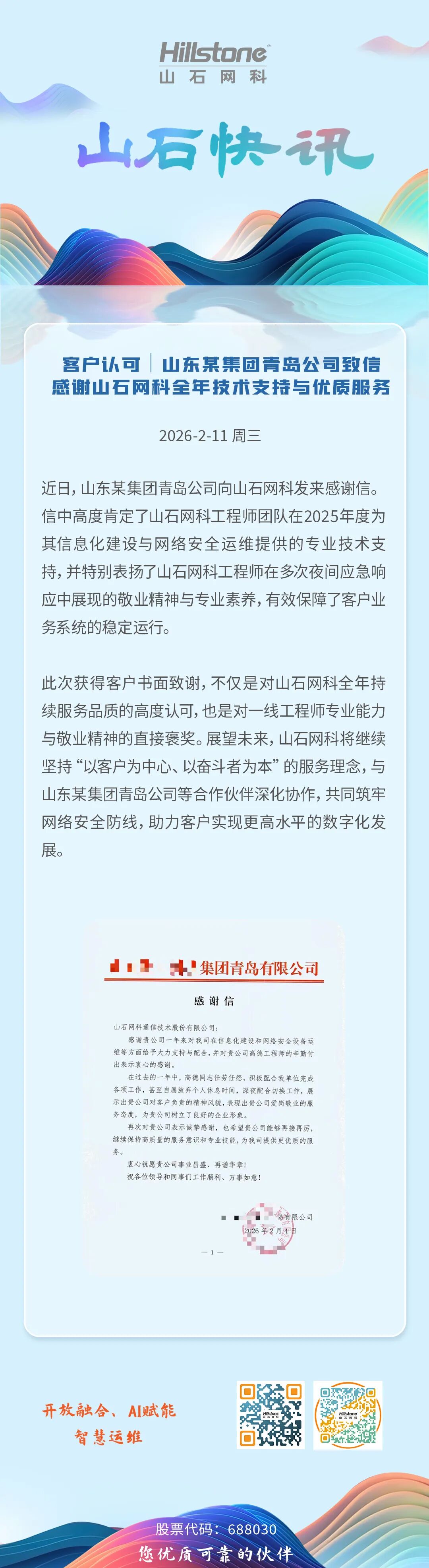 客户认可|山东某集团青岛公司致信感谢山石网科全年技术支持与优质服务
