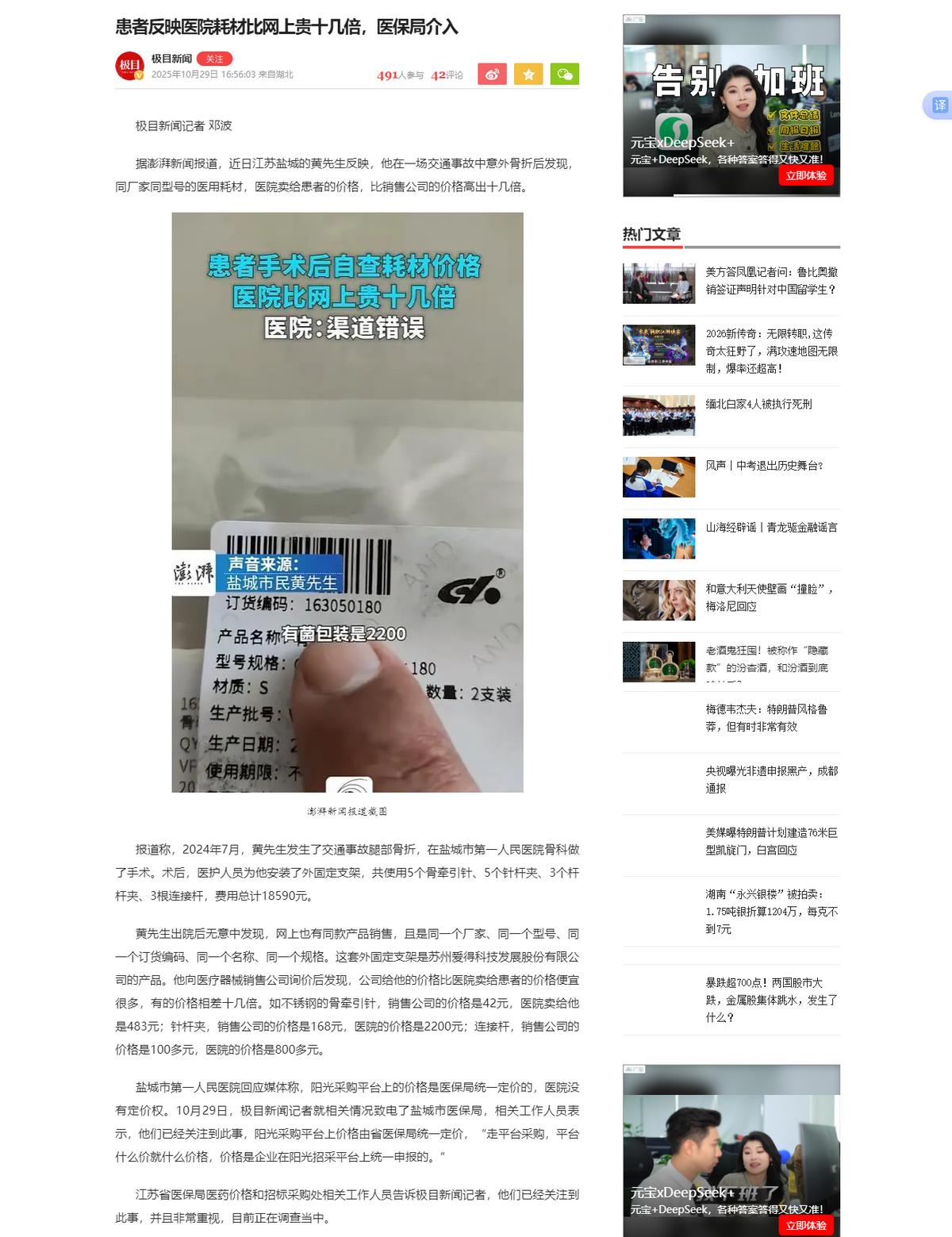 2025年10月28日,极目新闻刊发了一篇名为《患者反映医院耗材比网上贵十几倍,医保局介入》的报道。据该报道,患者黄某2024年7月腿部骨折在盐城第一人民医院骨科做手术,术后外固定支架运用到了骨牵引针、针杆夹等产品。但之后黄某发现自己所用的产品网上销售价格与医院价格相差十几倍。对此,也引起江苏省医保局和招标采购处的介入,目前正在调查中。