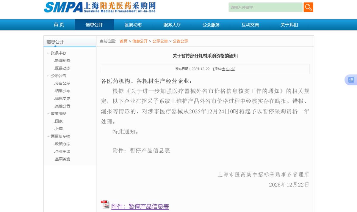 更值得关注的是,2025年末,爱得科技数百种型号的产品被上海相关部门暂停集采资格。根据上海阳光医药采购网2025年12月22日发布的《关于暂停部分耗材采购资格的通知》,包括爱得科技在内的三家企业在招采子系统上维护产品外省、市价格过程中经核实存在瞒报、错报、漏报等情形,上海市医药集中招标采购事务管理所对涉事医疗器械从2025年12月24日0时起,将予以暂停采购资格一年的处理。其中爱得科技被暂停的产品按照品名、规格、型号统计,超500种,而另外2家企业被暂停集采资格的产品型号合计为91种。