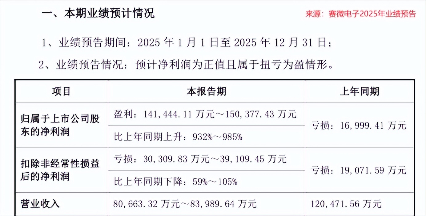 赛微电子发布的2025年业绩预告,字字彰显“逆袭”底气。公告显示,公司预计2025年实现净利润14.14亿元至15.04亿元,较上年同期实现巨幅增长,同比增速高达932%至985%,彻底告别此前的亏损状态,终于扬眉吐气。