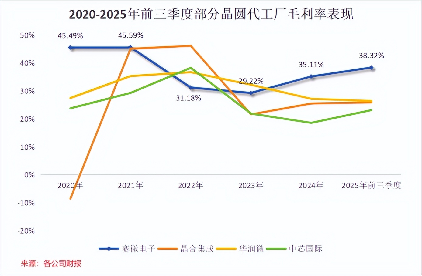财务数据显示,2024年全年以及2025年前三季度,赛微电子的毛利率均稳定在35%以上,保持高位运行。对比来看,国内晶圆代工龙头中芯国际2024年毛利率仅为18.59%,2025年三季度虽有提升但仍仅为23.15%;另一家晶圆代工厂商晶合集成2025年上半年毛利率为25.8%,全年预计维持在26%左右,与赛微电子的毛利率差距显著。