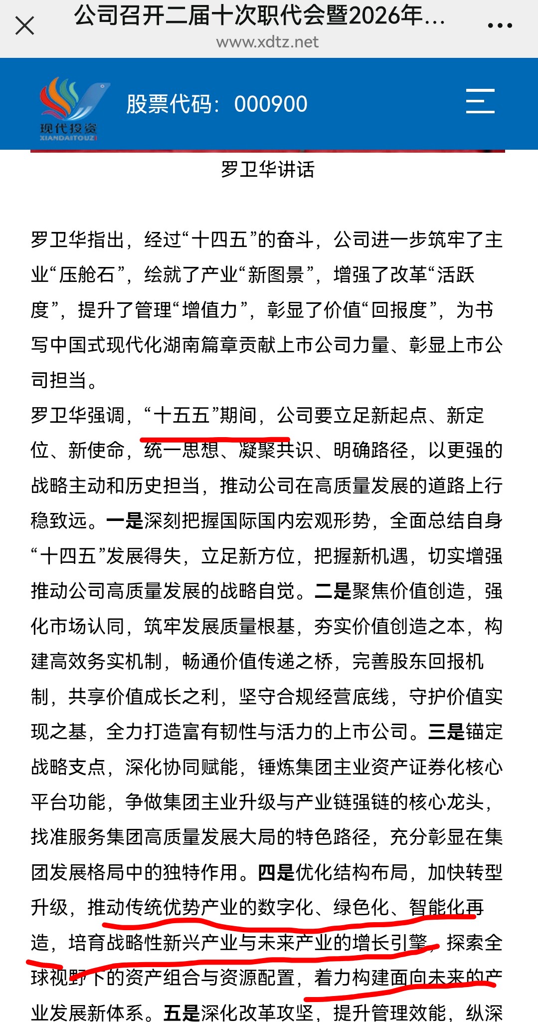 罗卫华强调,“十五五”期间,公司要立足新起点、新定位、新使命,统一思想、凝聚共识、明确路径,以更强的战略主动和历史担当,推动公司在高质量发展的道路上行稳致远。一是深刻把握国际国内宏观形势,全面总结自身“十四五”发展得失,立足新方位,把握新机遇,切实增强推动公司高质量发展的战略自觉。二是聚焦价值创造,强化市场认同,筑牢发展质量根基,夯实价值创造之本,构建高效务实机制,畅通价值传递之桥,完善股东回报机制,共享价值成长之利,坚守合规经营底线,守护价值实现之基,全力打造富有韧性与活力的上市公司。三是锚定战略支点,深化协同赋能,锤炼集团主业资产证券化核心平台功能,争做集团主业升级与产业链强链的核心龙头,找准服务集团高质量发展大局的特色路径,充分彰显在集团发展格局中的独特作用。四是优化结构布局,加快转型升级,推动传统优势产业的数字化、绿色化、智能化再造,培育战略性新兴产业与未来产业的增长引擎,探索全球视野下的资产组合与资源配置,着力构建面向未来的产业发展新体系。五是深化改革攻坚,提升管理效能,纵深推进经营管理机制改革,全面构建与一流企业对标的管理体系,着力锻造高素质专业化的人才队伍,持续激发组织内生动力与运行活力。六是坚持强根铸魂,始终把党的政治建设摆在首位,深化党建工作与生产经营深度融合,驰而不息推进全面从严治党,凝聚起团结奋进的磅礴力量,以高质量党建引领保障高质量发展。