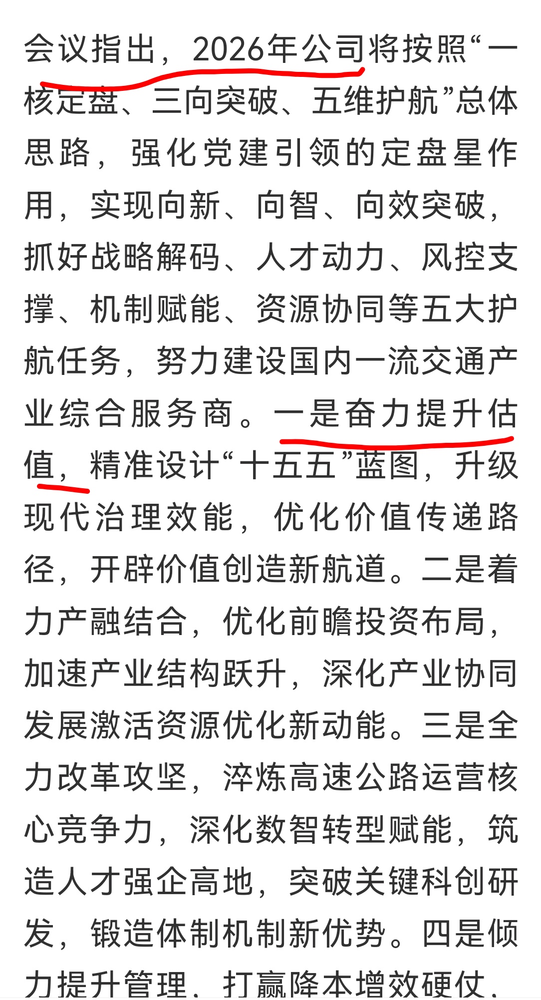 会议指出,2026年公司将按照“一核定盘、三向突破、五维护航”总体思路,强化党建引领的定盘星作用,实现向新、向智、向效突破,抓好战略解码、人才动力、风控支撑、机制赋能、资源协同等五大护航任务,努力建设国内一流交通产业综合服务商。一是奋力提升估值,精准设计“十五五”蓝图,升级现代治理效能,优化价值传递路径,开辟价值创造新航道。二是着力产融结合,优化前瞻投资布局,加速产业结构跃升,深化产业协同发展激活资源优化新动能。三是全力改革攻坚,淬炼高速公路运营核心竞争力,深化数智转型赋能,筑造人才强企高地,突破关键科创研发,锻造体制机制新优势。四是倾力提升管理,打赢降本增效硬仗,筑牢内部控制堤坝,铸强审计监督利剑,筑牢精益高效新基石。五是合力共建平安,严守安全生产红线,增强应急处险能力,抓好信访维稳工作,织密稳定发展新防线。六是聚力党业融合,把牢政治建设方向,深化党业融合质效,擦亮党建品牌名片,激活群团组织纽带,构筑红色引领新格局。七是勠力管党治企,织密立体监督网络,高悬正风肃纪利剑,厚植廉洁文化沃土,涵养风清气正新生态。八是倾力回馈社会,优化持续回报机制,夯实路网金融基础,办好暖心民生工程,彰显责任担当新境界。